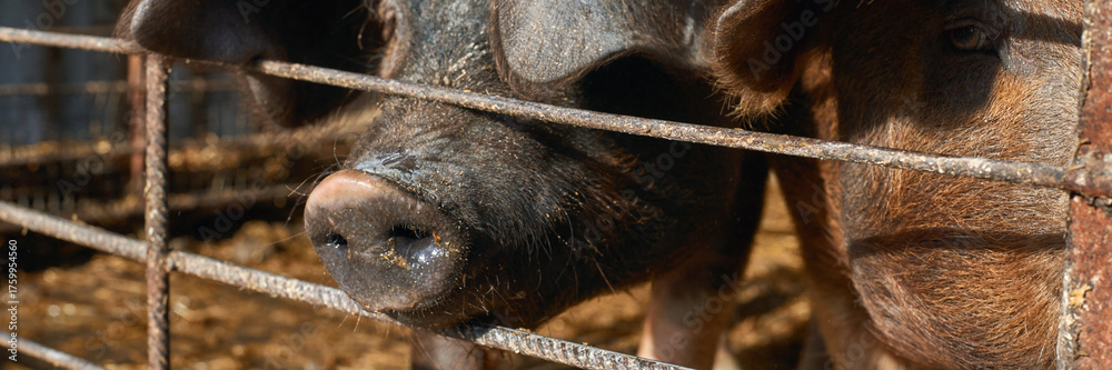 Close-up of pigs in rustic barnyard pen with metal fence on sunny day.