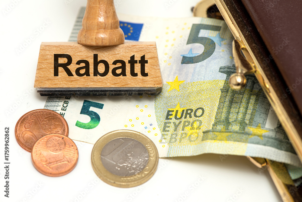 Ein Holzstempel ist beschriftet mit dem Aufdruck Rabatt als Symbolbild für die Ankurbelung des Handels, Einzelhandels und der gesamten Wirtschaft durch Sonderangebote und Rabatte