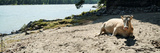 Cow resting on sandy riverbank in sunny landscape with trees and water view.