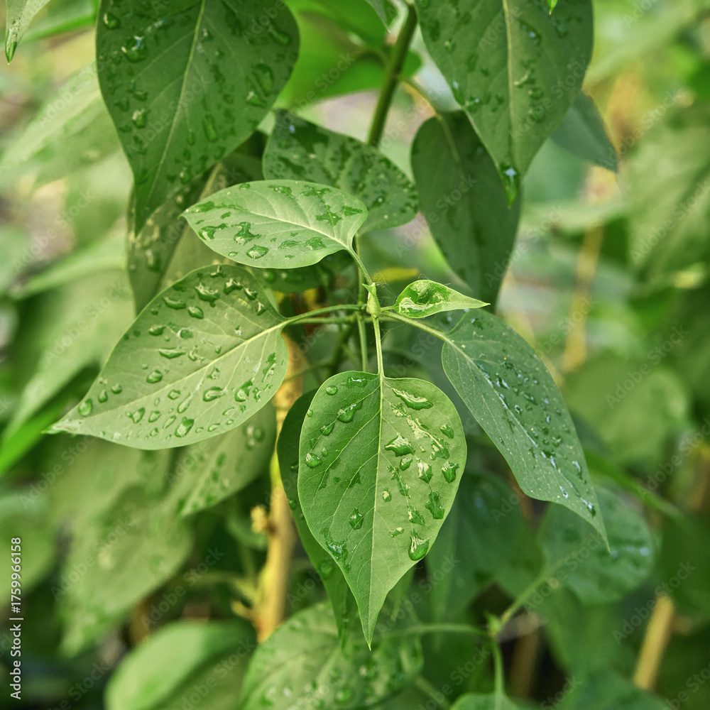 Fresh green leaves with water droplets in lush garden environment on a bright day.