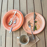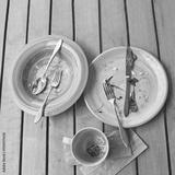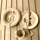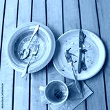 Empty plates and coffee cup on wooden table after meal with cutlery and napkin.
