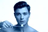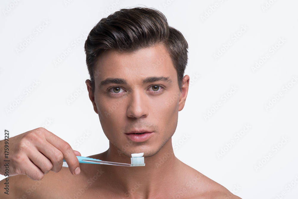 Attractive youthful guy is standing with brush for teeth
