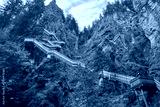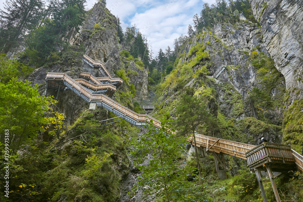 Blick auf die berühmte Kitzlochklamm in Österreich, mit abenteuerlichen Holzwegen und Treppen.