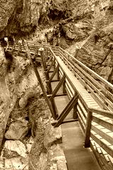 Blick auf die berühmte Kitzlochklamm in Österreich, mit abenteuerlichen Wegen und Treppen.