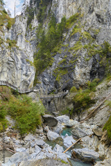 Blick auf die berühmte Kitzlochklamm in Österreich, mit abenteuerlichen Wegen und Treppen.