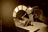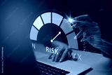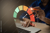 Business risk management concept with risk level indicator on virtual screen. A professional hand analyzing high risk on digital dashboard, suitable for finance, insurance, or investment content.