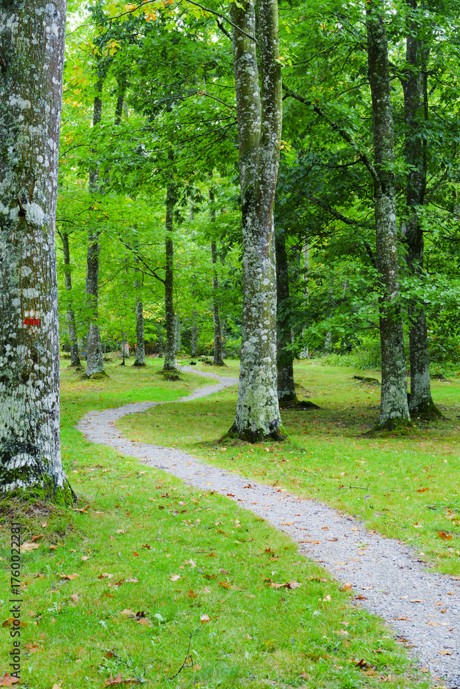 Forest trail. A path crosses a forest of green oak trees, Navarre.