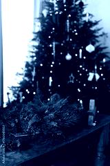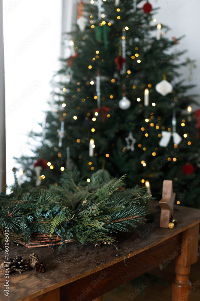 Making Christmas wreath. Christmas wreath with fir, pine and cedar branches, scissors and rustic star on wooden table on background of stylish xmas tree. Winter holidays preparation and decor