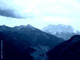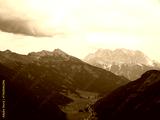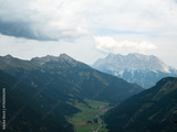 Scenic mountain view of the Zugspitze seen from the Almkopf in Austria. Majestic alpine landscape with dramatic peaks.