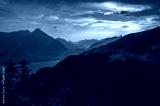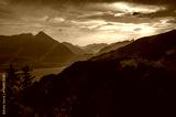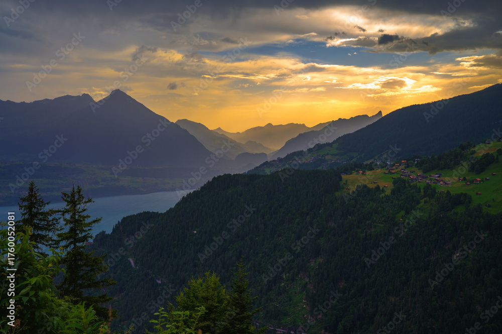 Sunset panorama from Harder Kulm overlooking Thunersee and the surrounding Swiss Alps, with dramatic clouds and lush green valleys in Switzerland.
