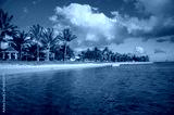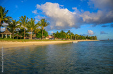 Scenic view of the beach with palm trees and tourist resorts in Bel Ombre, southern Mauritius.