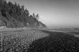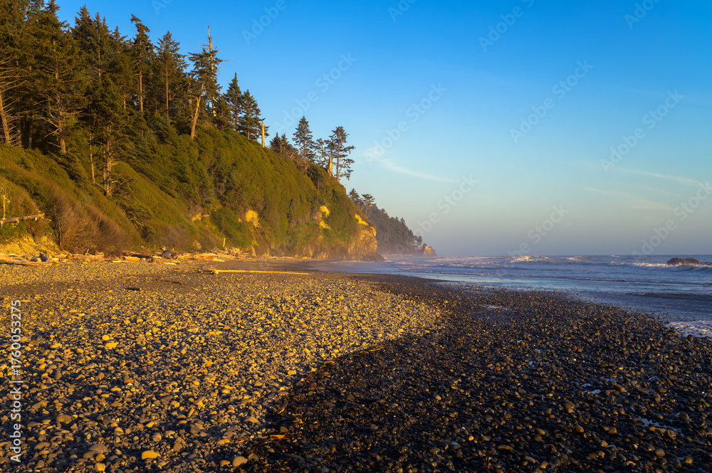 Ruby Beach shows a pebble shore with steep, forested cliffs under clear evening light in Washington State.