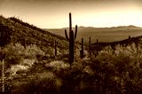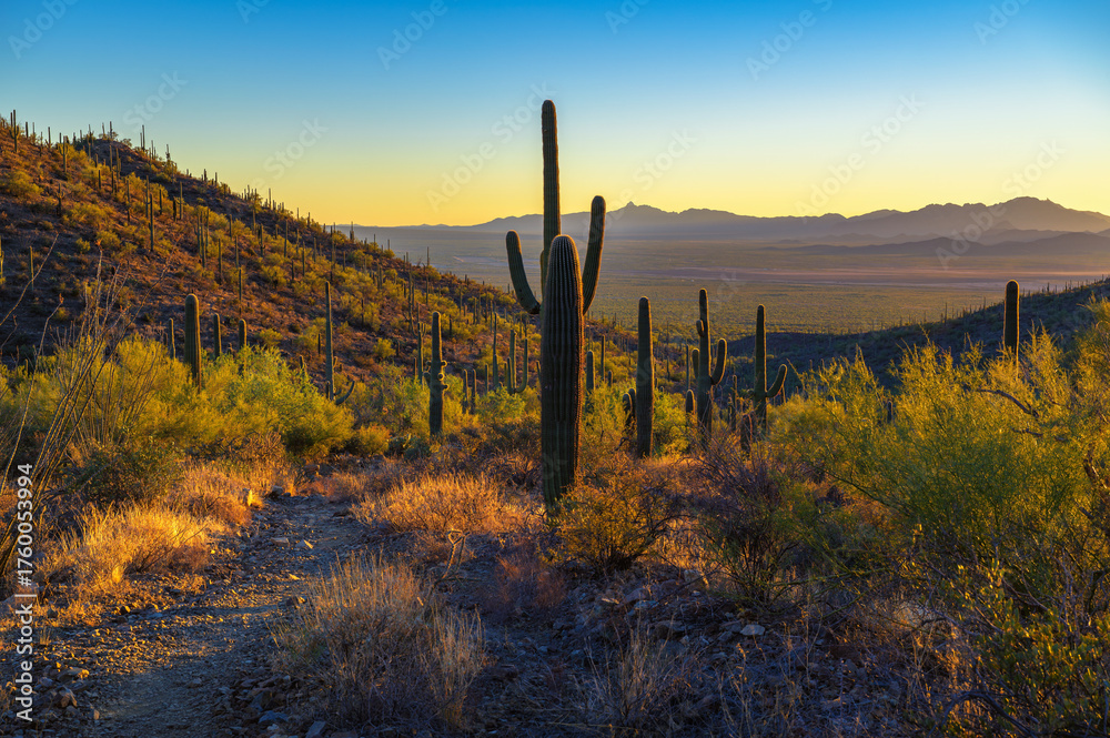 Scenic sunset view over King Canyon Trailhead with saguaro cacti in Saguaro National Park West, near Tucson, Arizona