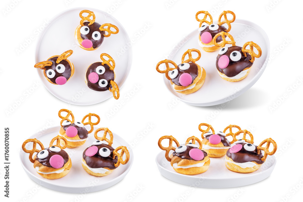 Sweet vanilla profiteroles in the form of deer for Christmas holidays on a white isolated background
