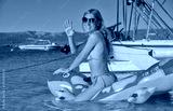 girl in a pink swimsuit swims on an inflatable toy in the sea water on the beach of the Adriatic coast