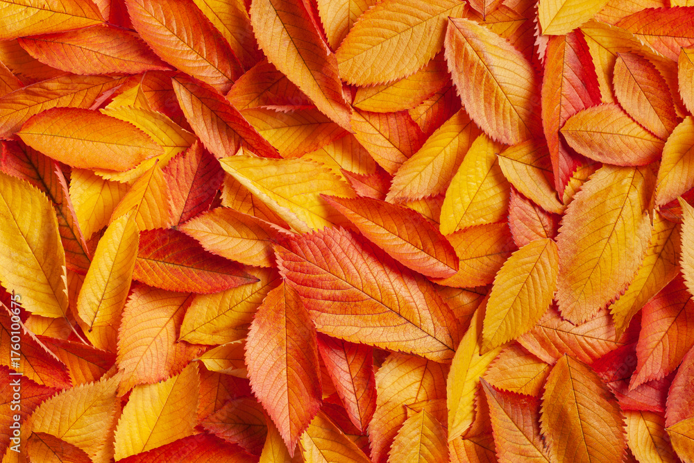 This vibrant, full-frame image captures a dense, overlapping pile of small, serrated autumn leaves. The color palette is a brilliant mix of deep reds, fiery oranges, and golden yellows, warm backdrop