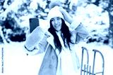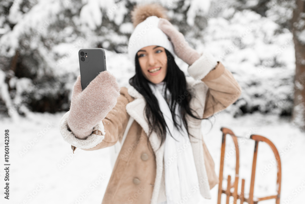 Happy woman dressed in winter clothes holds a smartphone and takes a selfie or talks online while standing against the backdrop of snowy nature in winter during the Christmas holidays.
