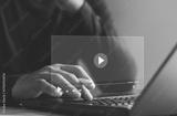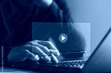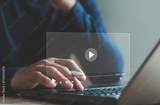 Businessman using laptop to play online video, showing digital media streaming interface and modern technology for video content, online learning or entertainment platform for marketing and education.