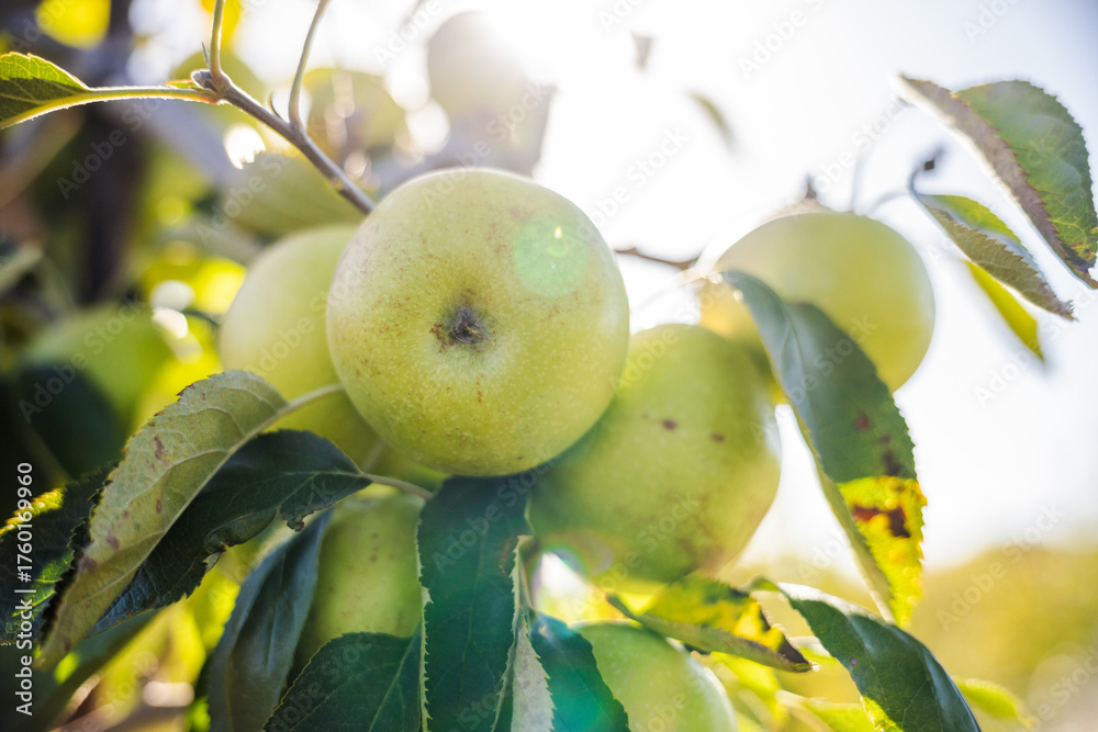 Fresh green apples hanging on a tree branch under sunlight during harvest season
