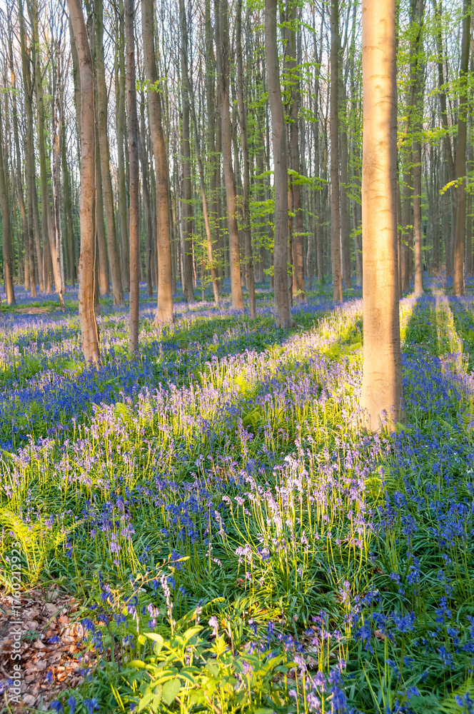 The rising sun illumingating a flowerbed of bluebells in the Hallerbos, on an early spring morning.
