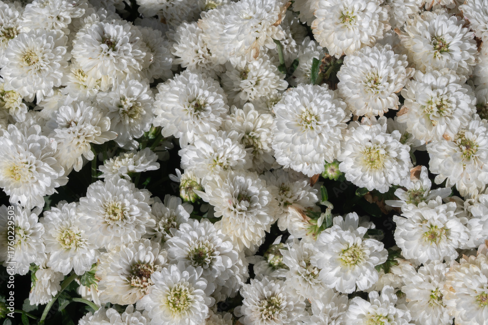 Full frame shot of white Chrysanthemum flowers blooming. White flowers can mean reverence and humility, purity and innocence or sympathy for a bereavement.