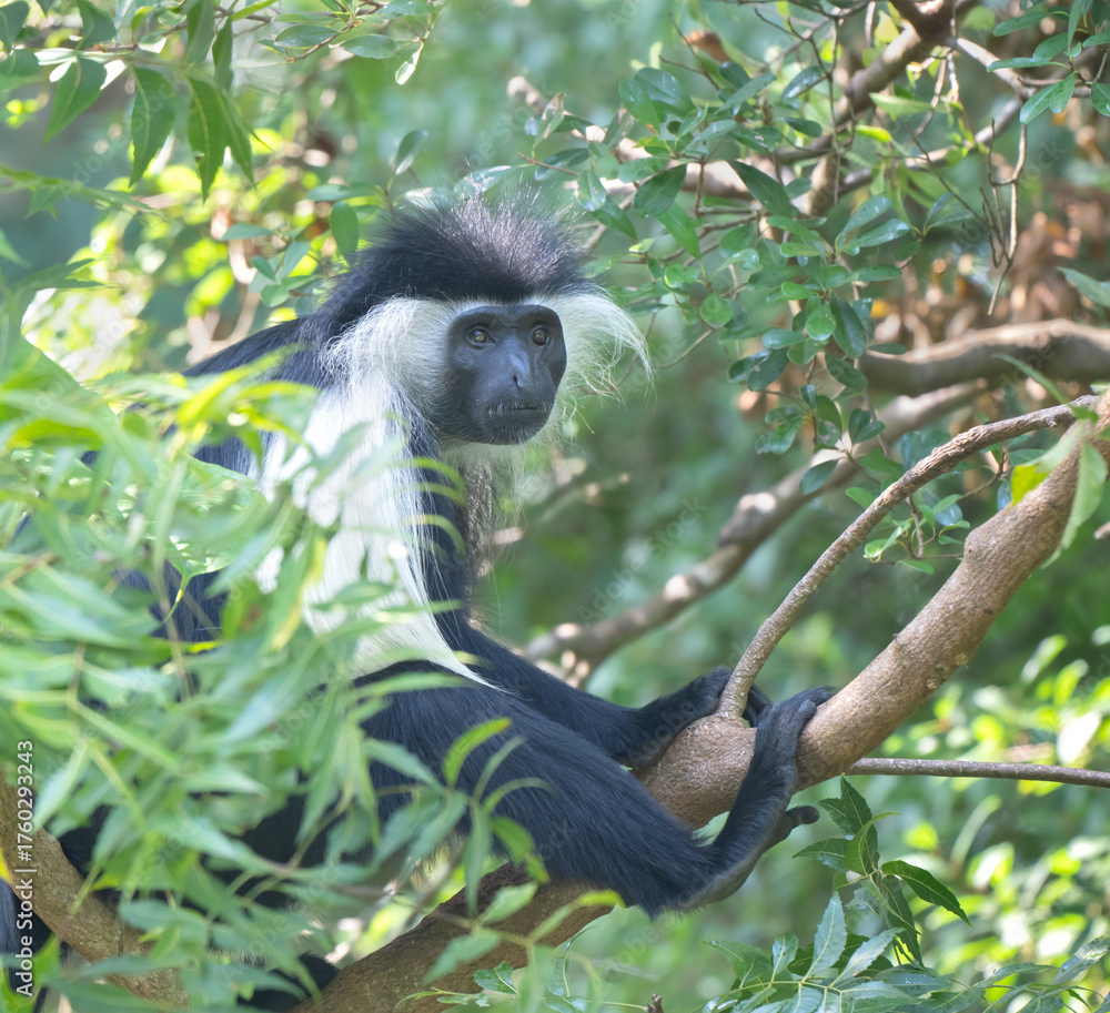 Endangered Angola black-and-white colobus monkey (Colobus angolensis) in tropical forest canopy of Shimoni Forest, Kenya