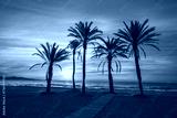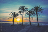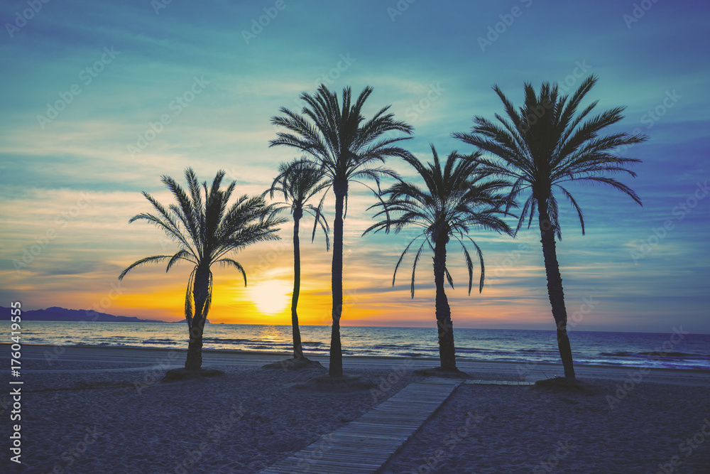 Seascape in the early morning during a beautiful sunrise. Palm trees on the beach. San Juan beach, Alicante, Spain