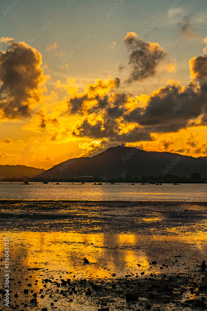 As evening light paints the sky in orange and gold, the Big Buddha stands proudly atop the mountain, surrounded by glowing clouds and tranquil air a perfect symbol of calm and enlightenment.