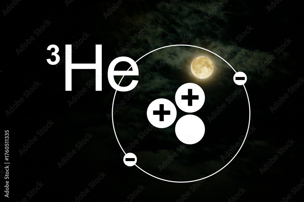 Helium 3 on the Moon is shown by the model of the atom of isotope and photo of the moon