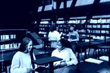 Two female students are talking and sitting at a table while two other female students are standing and talking next to them