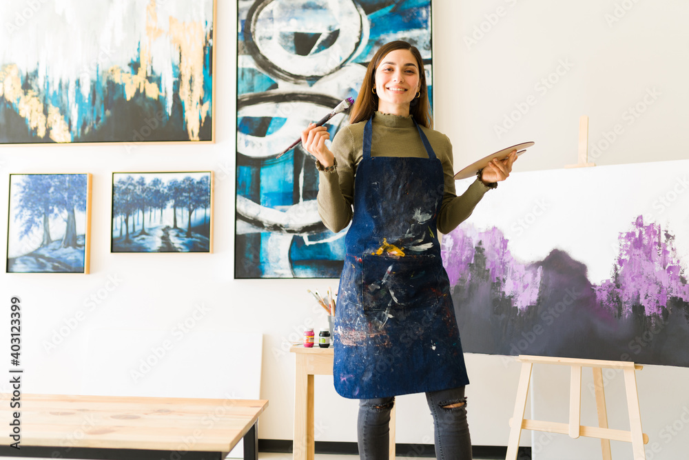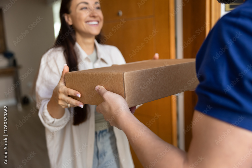 Cropped shot smiling woman customer receive dispatch from postal courier