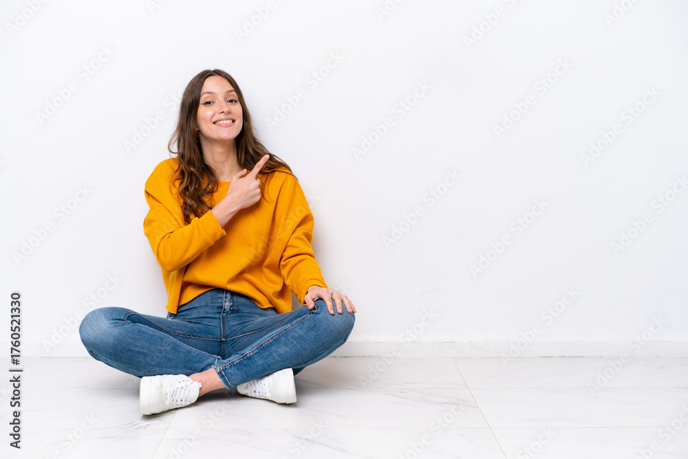 Young caucasian woman sitting on the floor isolated on white wall pointing to the side to present a product