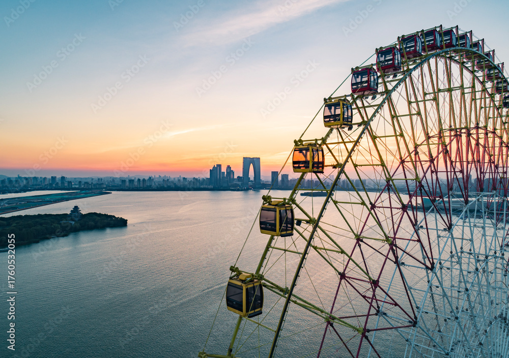 Colorful ferris wheel overlooking water at sunset with city skyline in background