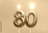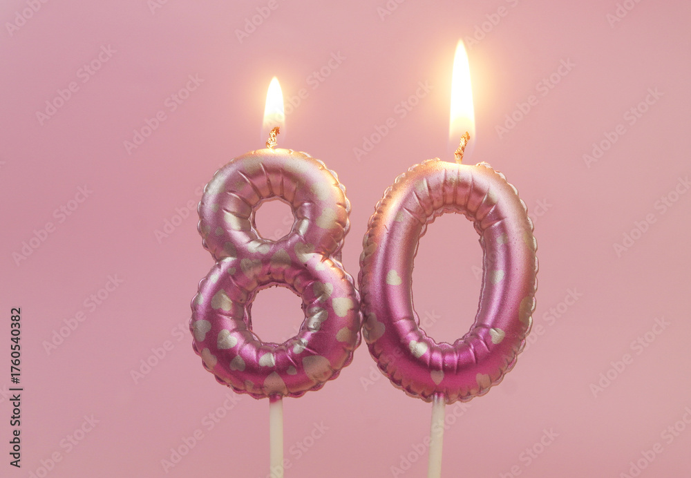 Burning air balloon shaped birthday candles with hearts on pink background, number 80