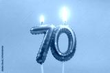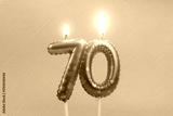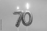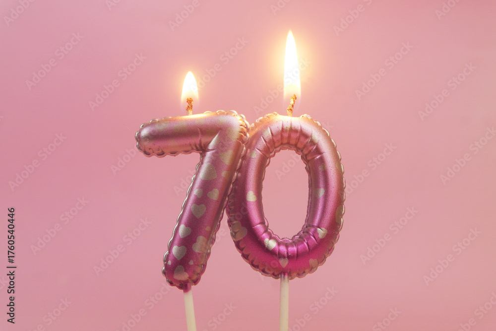 Burning air balloon shaped birthday candles with hearts on pink background, number 70