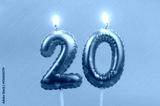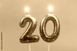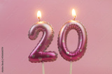 Burning air balloon shaped birthday candles with hearts on pink background, number 20