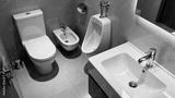 A modern bathroom featuring a toilet, bidet, urinal, sink, toilet brush, toilet paper holder, and light - colored tiles.