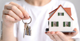 Realtor holding a model of a house in his hands. Concept of mortgage lending