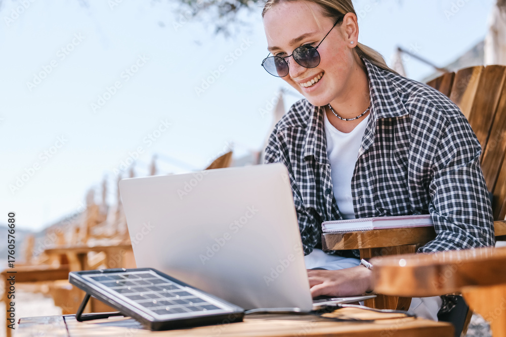 Beach workation digital nomad plans tasks with laptop and notebook on lounge chairs, powered by a portable solar charger. Eco-friendly, productive, flexible lifestyle by the sea. now