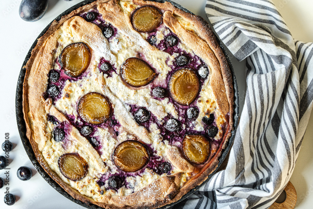 Pie, quiche, or cheesecake with cottage cheese, blueberries, and prunes. A delicious and beautiful breakfast. View from above. High quality photo