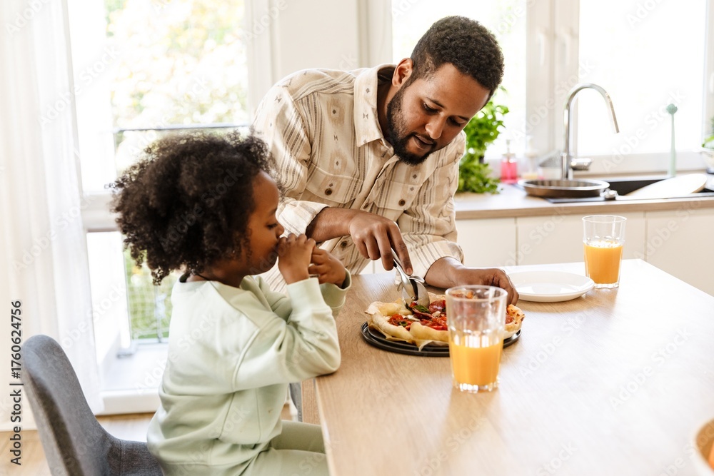 A father stands and cuts a pizza at a table where his daughter sits