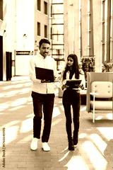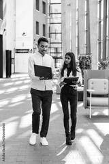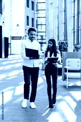 A female worker carries folders and listens to a male worker who shows her a laptop while they are walking