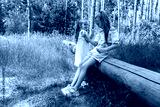 Little girls sit on logs near a pine tree. Children talk and communicate.
