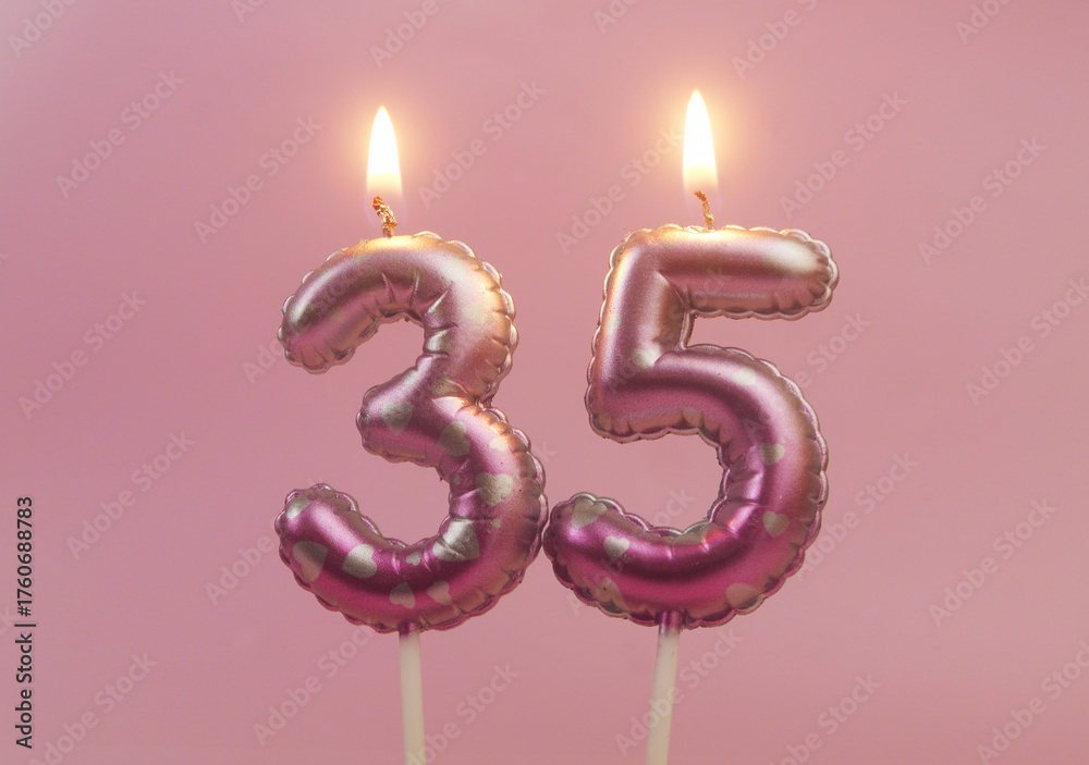 Burning air balloon shaped birthday candles with hearts on pink background, number 35