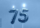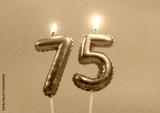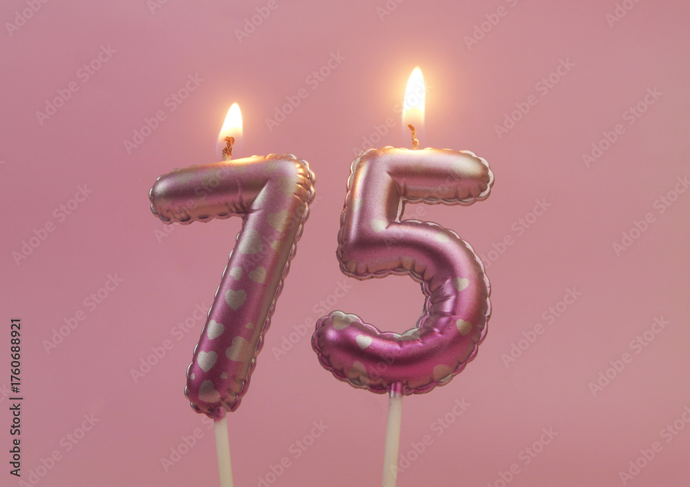 Burning air balloon shaped birthday candles with hearts on pink background, number 75
