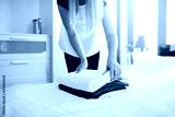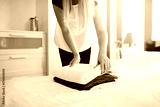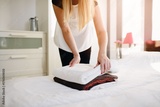 Hotel maid putting clean fresh towels on bed
