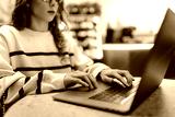 Female freelancer types on laptop while sitting in cozy cafe. Close-up. Female hands working on a laptop at a table indoors. Concepts for remote work, business, and study.