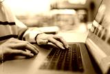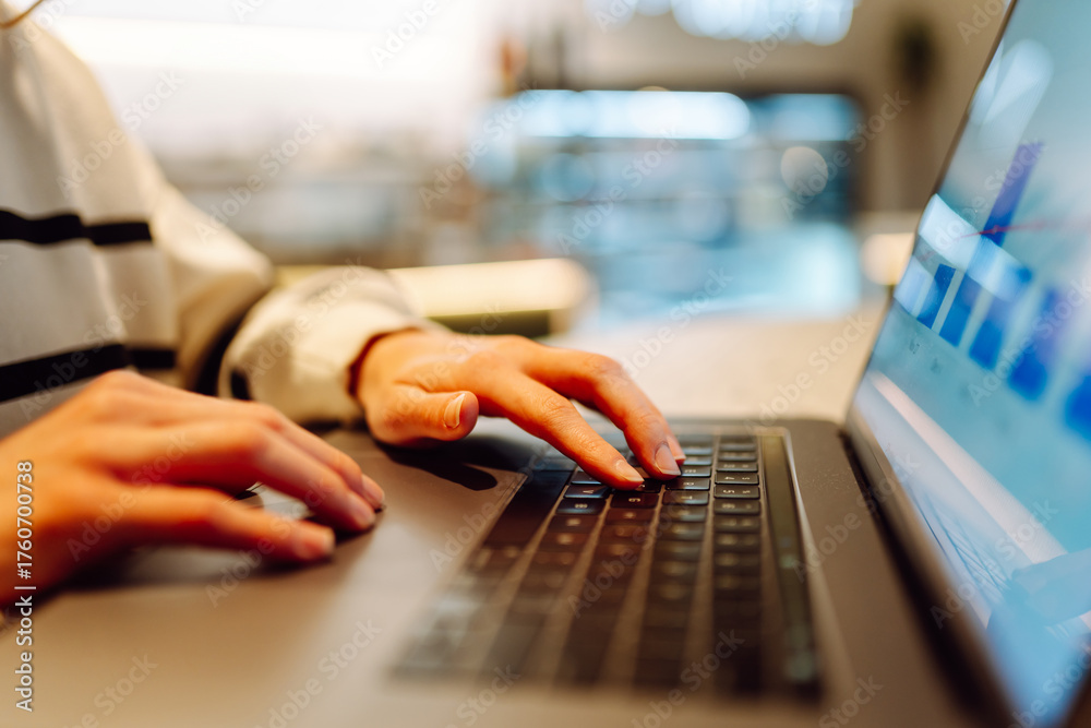 Female freelancer types on laptop while sitting in cozy cafe. Close-up. Female hands working on a laptop at a table indoors. Concepts for remote work, business, and study.