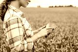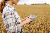 Female farmer in golden wheat field with digital tablet at sunset. Experienced female agronomist works in field, checking quality of crop using modern technology. Concept of farming, agriculture.