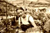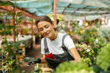 A joyful woman tends to vibrant flowers in a lively market, showcasing her passion for gardening and nature